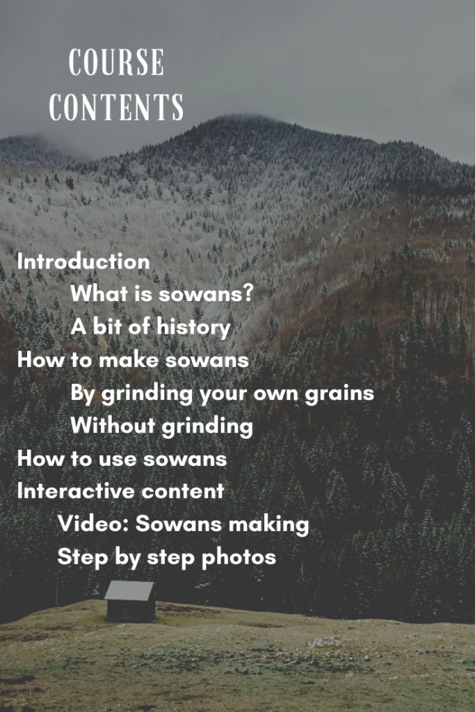 Sowans mini class This course, and all its content, are copyrighted 2021 by Root Food, LLC and not to be reproduced or used for commercial gain by other entities. Thank you! Up next: What is sowans? Clickable course links: What is sowans A bit of history How to make sowans by grinding grains How to make sowans without grinding How to use sowans Step by step video Step by step photos